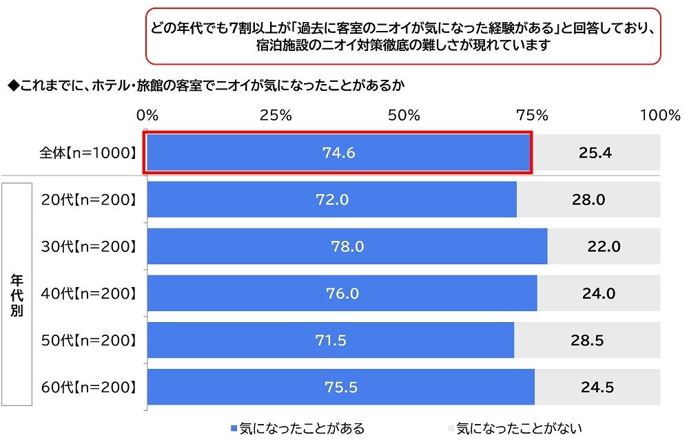 全回答者(1,000名)に、これまでに、ホテル・旅館の客室でニオイが気になったことがあるか聞いたところ、「気になったことがある」は74.6%と、宿泊者の大半は客室内における不快なニオイを経験しているという実状が明らかになりました。