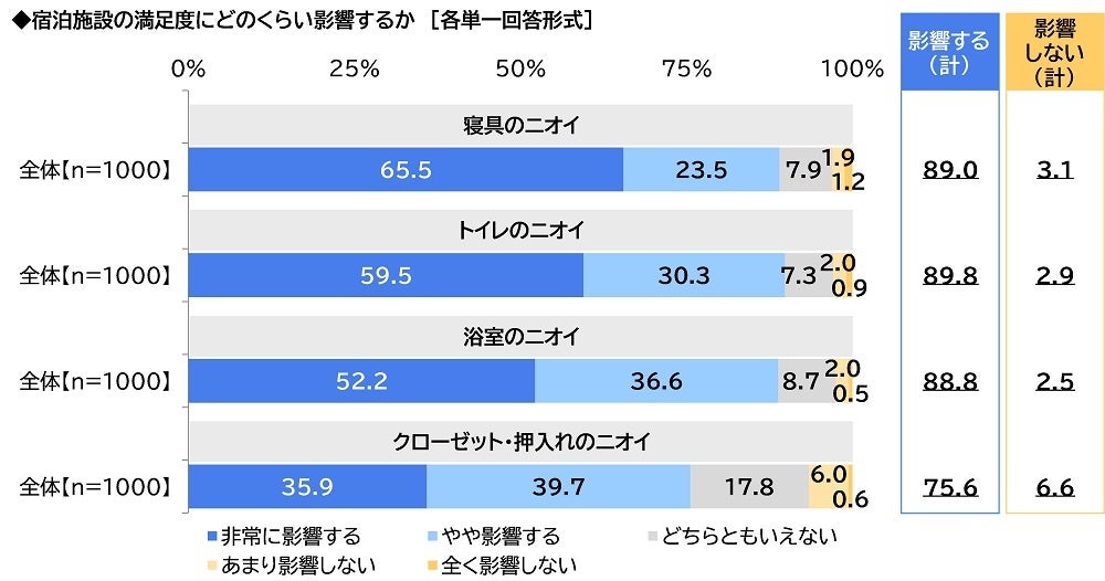 【部屋のニオイ(トイレ・浴室除く)】では、「非常に影響する」が58.4%、「やや影響する」が30.5%で、合計した『影響する(計)』は88.9%、「全く影響しない」が1.2%、「あまり影響しない」が2.6%で、合計した『影響しない(計)』は3.8%、「どちらともいえない」は7.3%でした。大多数の人が、部屋のニオイによって宿泊施設の満足度が低下すると考えているようです。