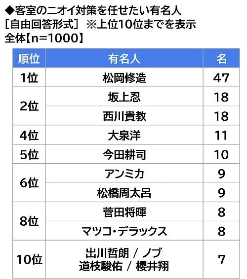全回答者(1,000名)に、客室のニオイ対策を任せたい有名人を聞いたところ、「松岡 修造さん」(47名)がダントツとなり、2位「坂上 忍さん」「西川 貴教さん」(いずれも18名)が続きました。