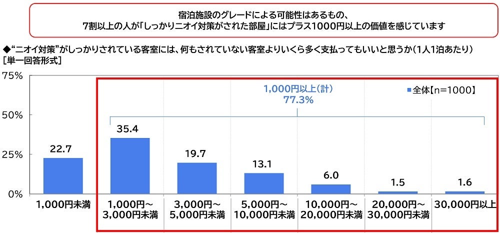全回答者(1,000名)に、“ニオイ対策”がしっかりされている客室には、何もされていない客室よりいくら多く支払ってもいいと思うか(1人1泊あたり)聞いたところ、「1,000円~3,000円未満」(35.4%)に回答が集まりました。