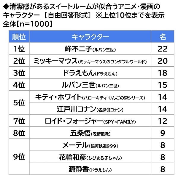 清潔感があるスイートルームが似合うアニメ・漫画のキャラクターを聞いたところ、1位「峰 不二子(ルパン三世)」(22名)、2位「ミッキーマウス(ミッキーマウスのワンダフルワールド)」(20名)、3位「ドラえもん(ドラえもん)」(18名)となりました。