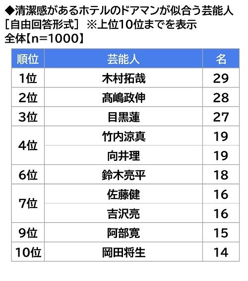 ◆清潔感があるホテルのドアマンが似合う芸能人 1位「木村 拓哉さん」2位「髙嶋 政伸さん」3位「目黒 蓮さん」