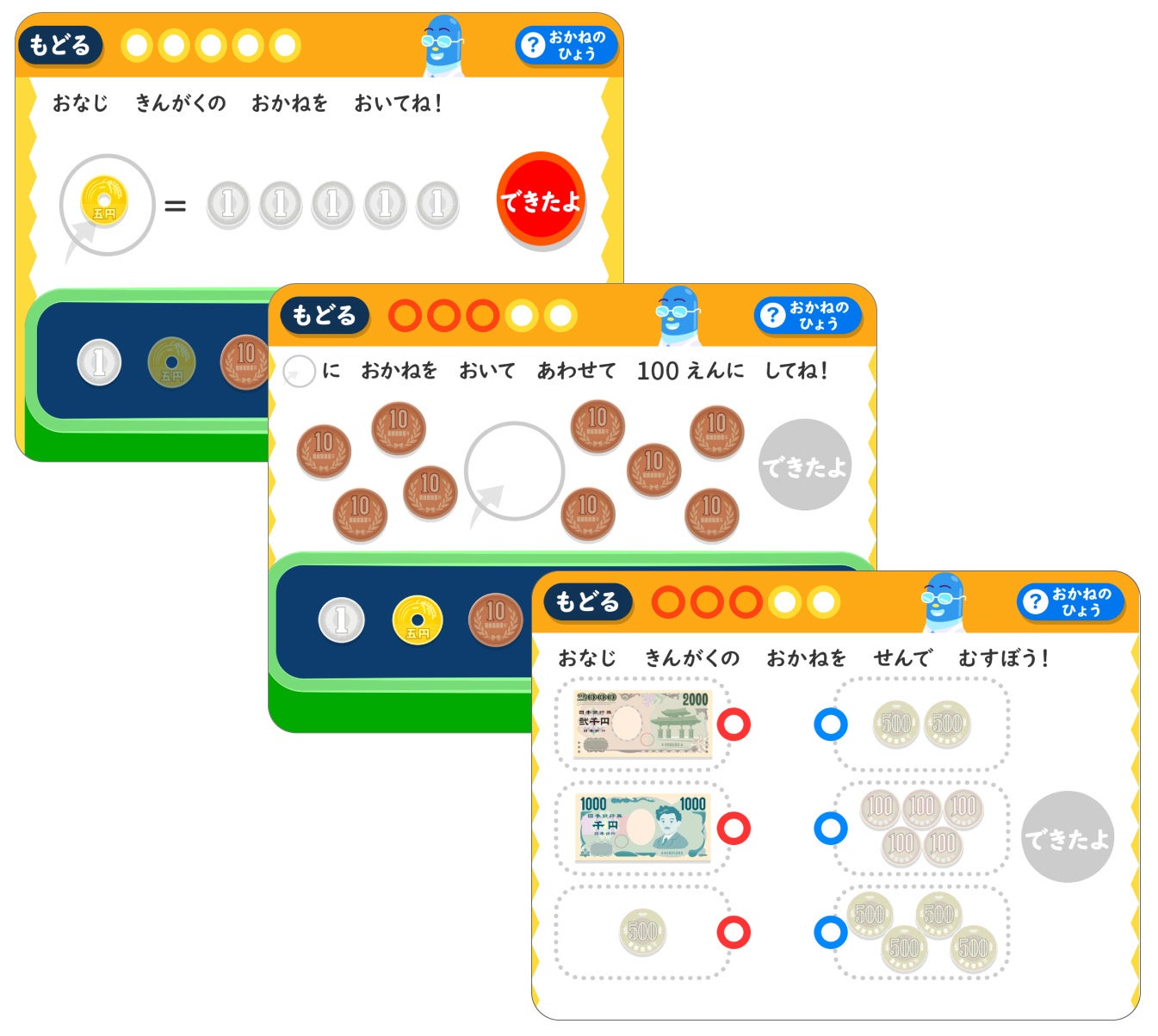 そこで本アプリでは、最初は10円までの硬貨からスタートし、スモールステップで扱うお金の種類や金額が増えることで、楽しくお金の計算力を伸ばせるように工夫しました。
