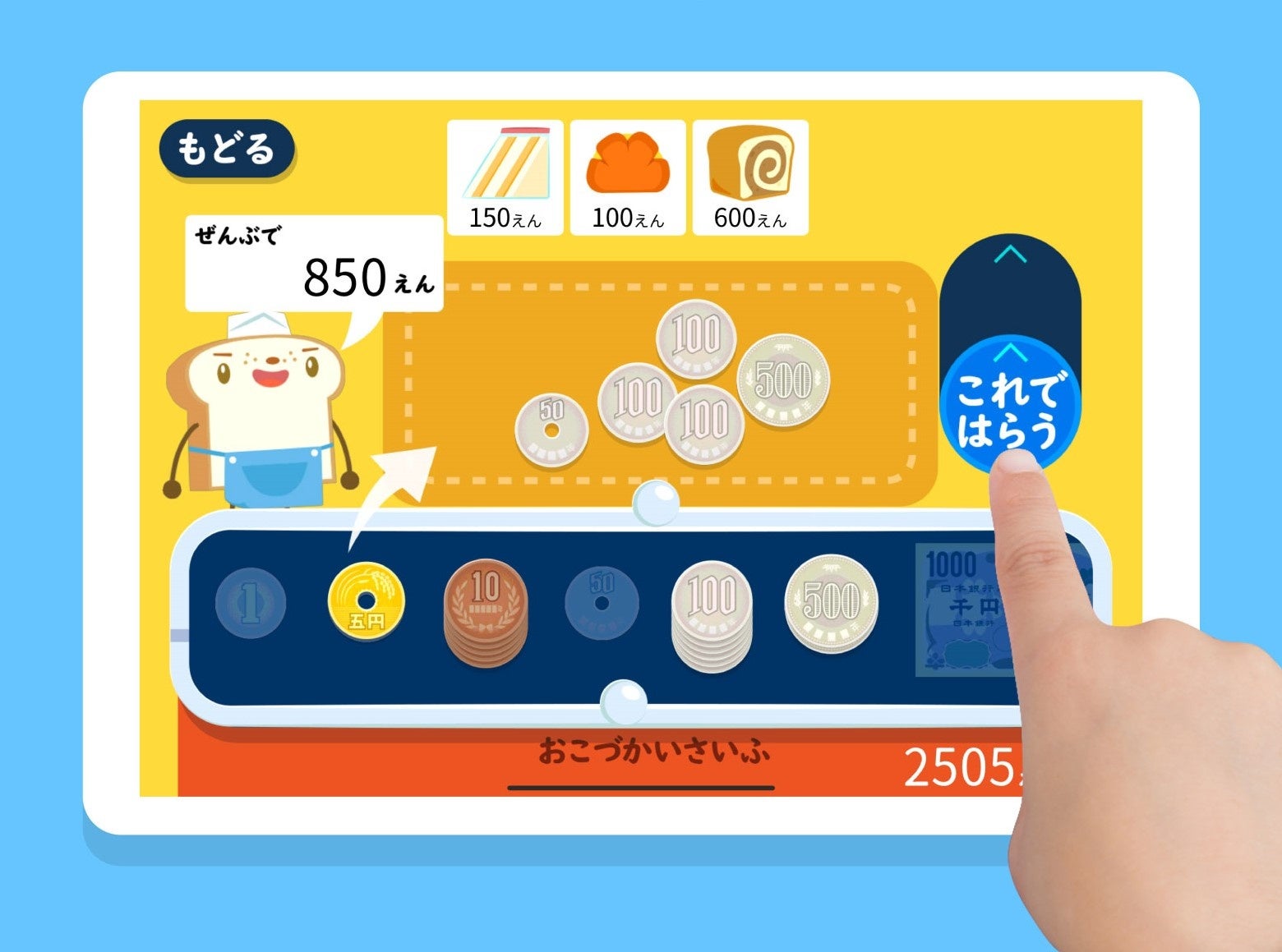 日常生活で、子ども自身が「ものの価値」や「金銭感覚」を意識するシーンは、意外と少ないものです。そこで本アプリでは、少し手間でも「自分でお札や硬貨を動かして支払う」ことを重視しています。くり返し触ることでお金の種類や、効率よく支払う方法を気づいて学んで欲しいからです。