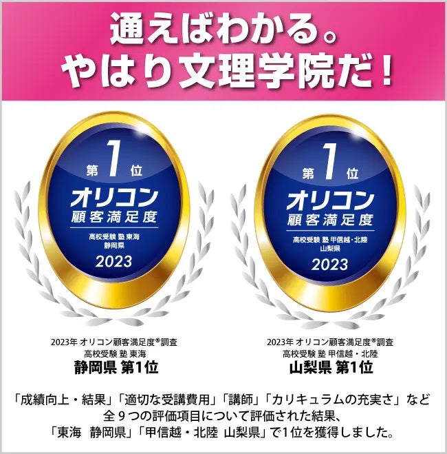 文理学院は「2023年 オリコン顧客満足度®ランキング 高校受験 塾 東海 静岡県/甲信越・北陸 山梨県」において、山梨県では5年連続の1位、静岡県では3度目(2018年、2019年、2023年)の1位となりました。