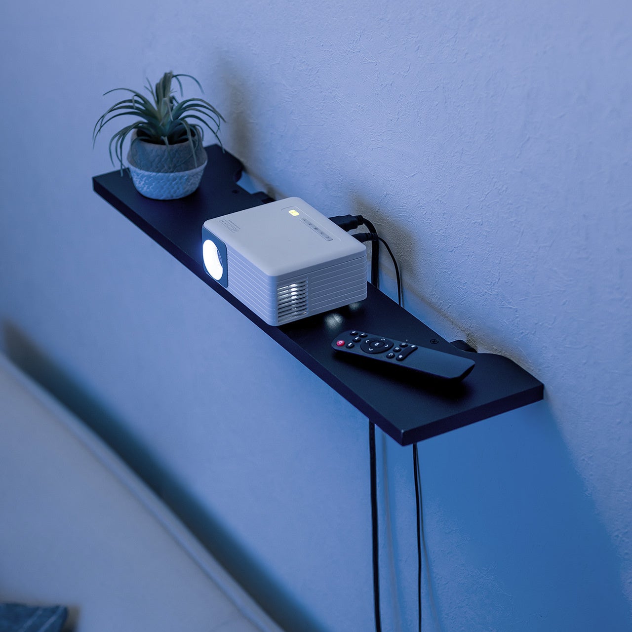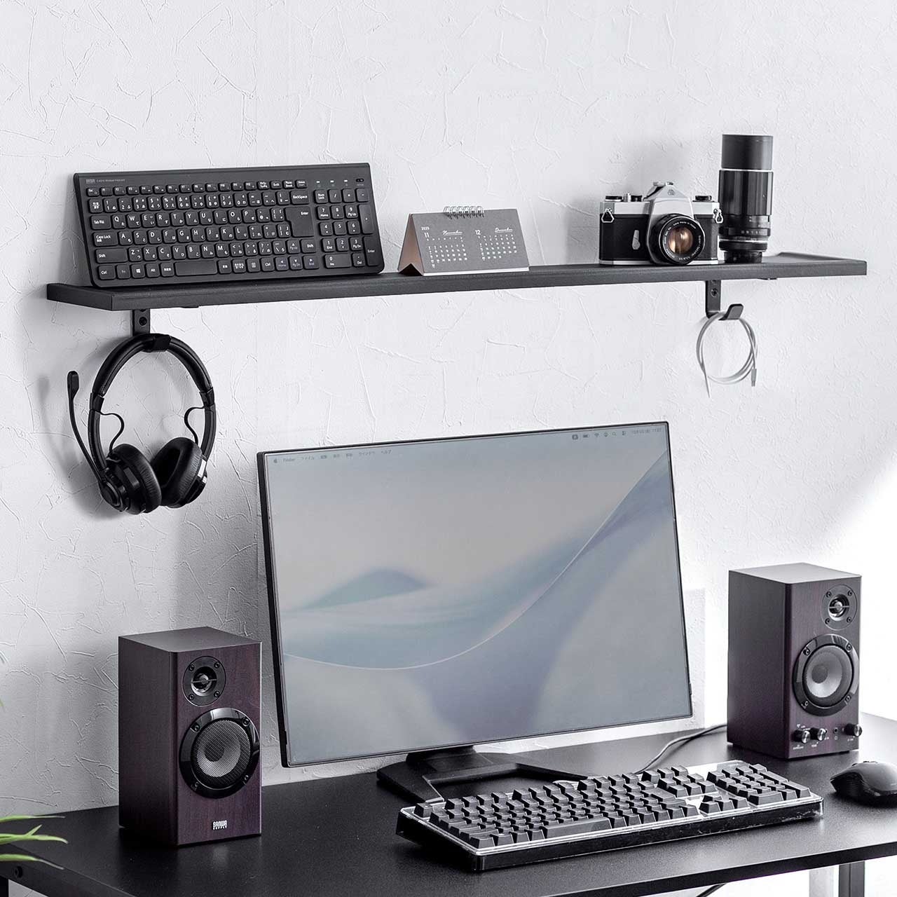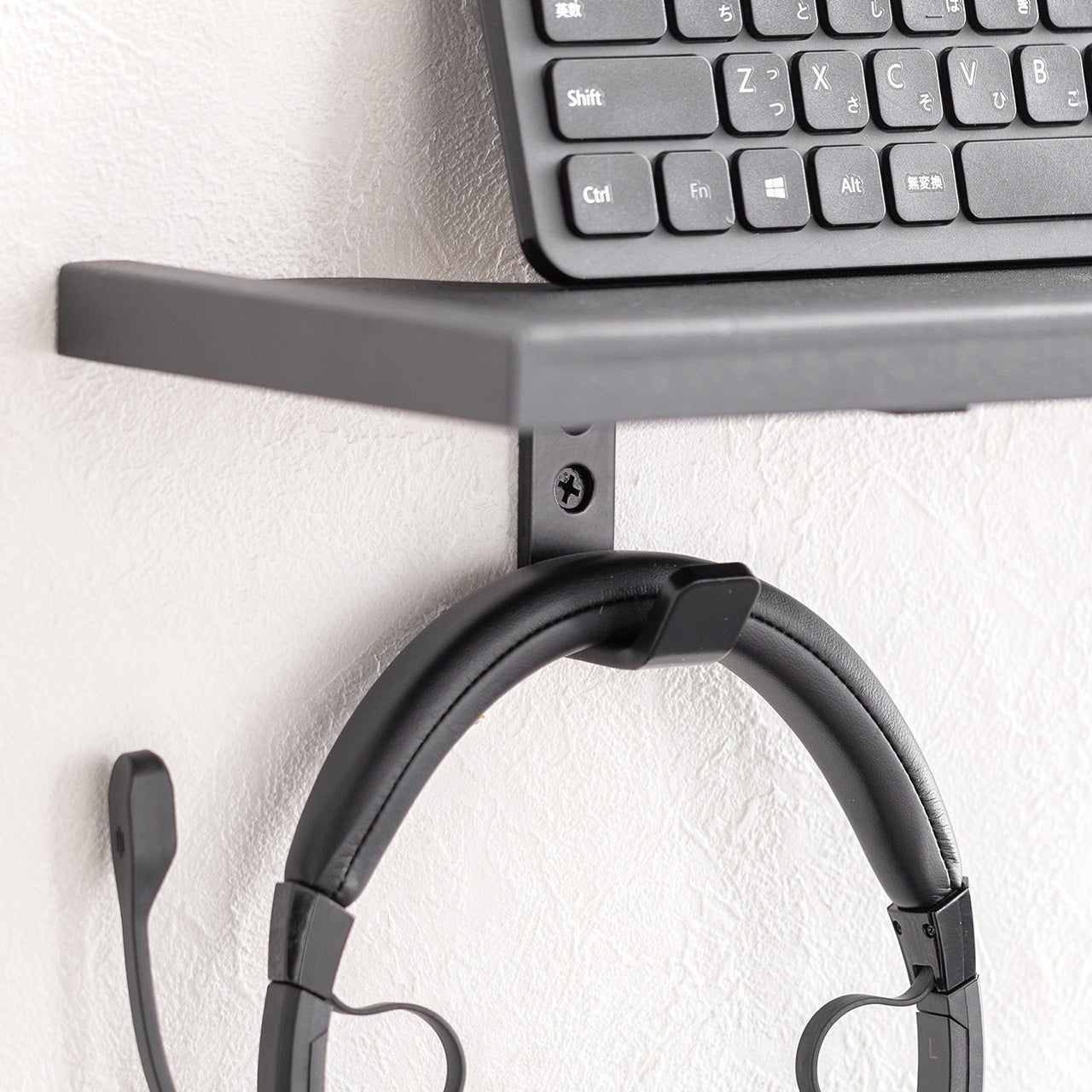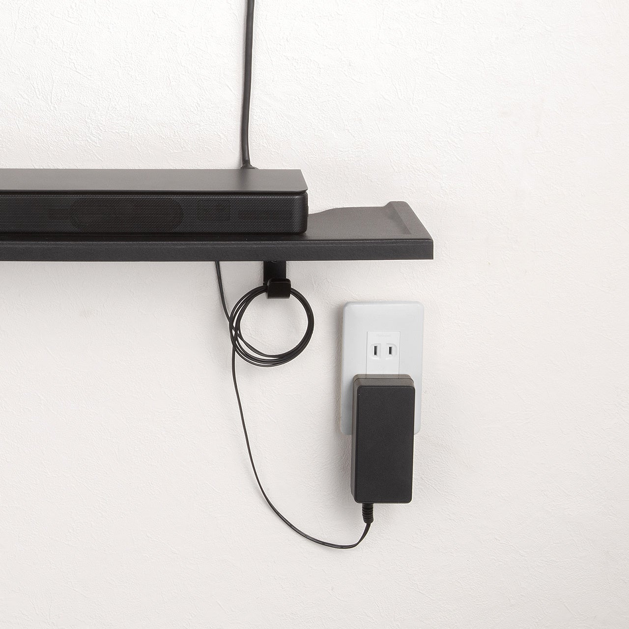 ブラケット下にはフックを2つ搭載し、余ったケーブルをまとめたり、ヘッドホンや小物を引っ掛けたりと、プラスαの収納力を発揮します。棚の上だけでなく下側のスペースまで有効活用できるため、限られた壁面でも整理整頓しやすいのが魅力です。見せたくないケーブル類をまとめながら、よく使うアイテムはサッと手に取れる位置に置けるので、快適な使用環境づくりに役立ちます。