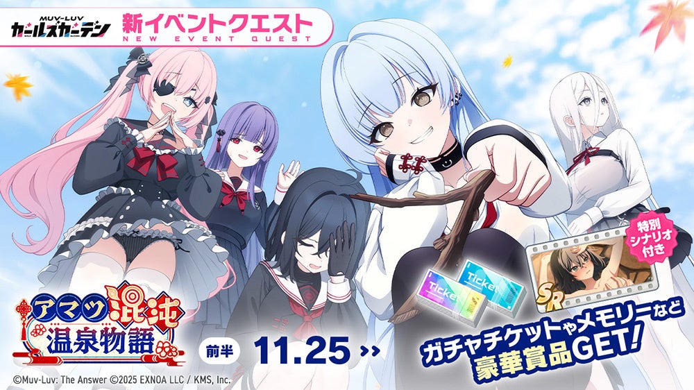 合同会社EXNOA(本社:東京都港区、CEO:東條 寛、URL:https://games.dmm.com/)と株式会社KMS(本社:東京都品川区、代表:梶原 健太郎、URL:http://kms3.com/ )が贈るマブラヴ最新作『マブラヴ ガールズガーデン』(以下、マブガル)が11月25日(火)より新イベント【アマツ混沌温泉物語】を開催したことをお知らせいたします。