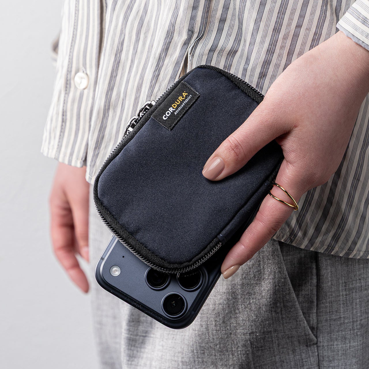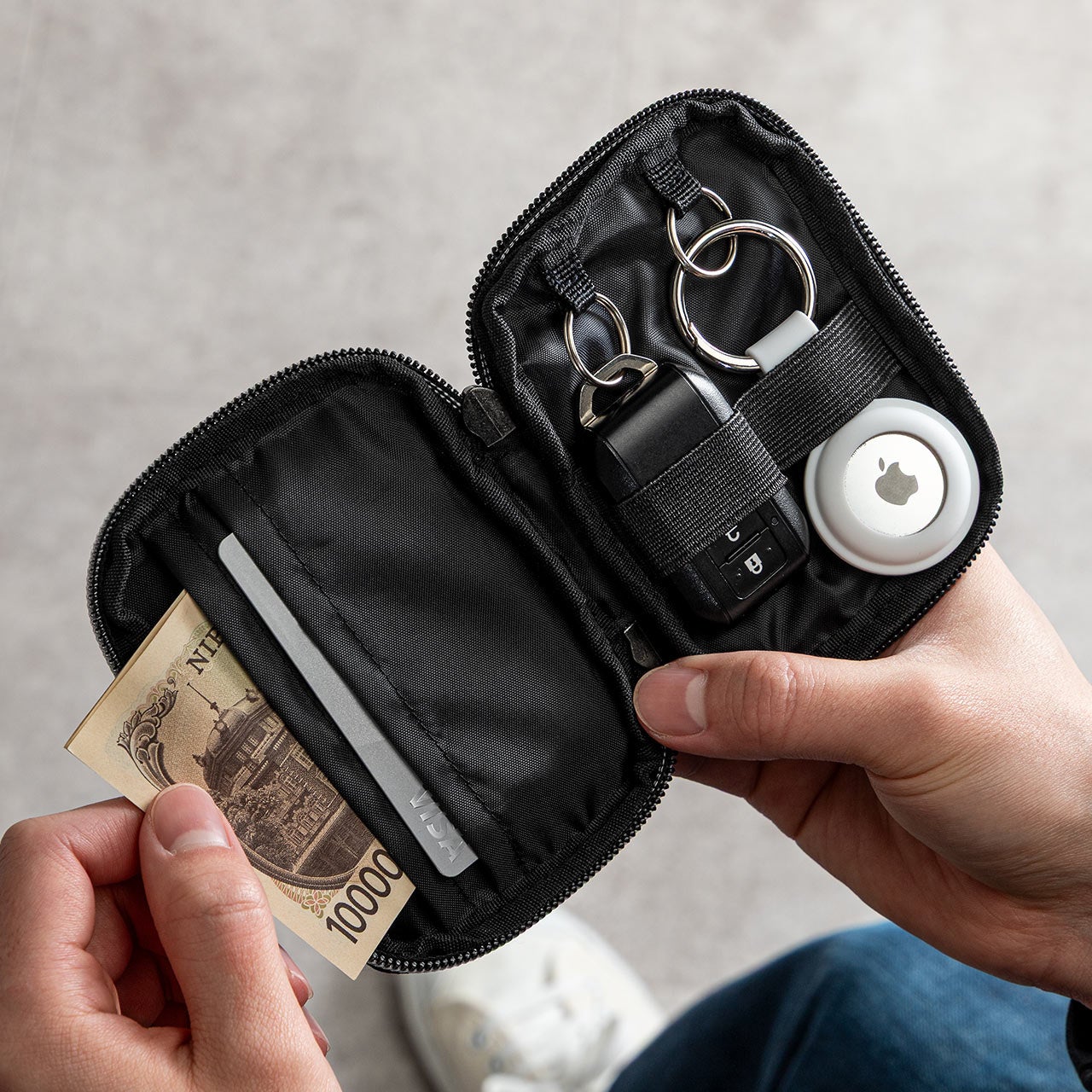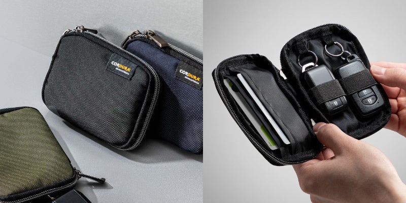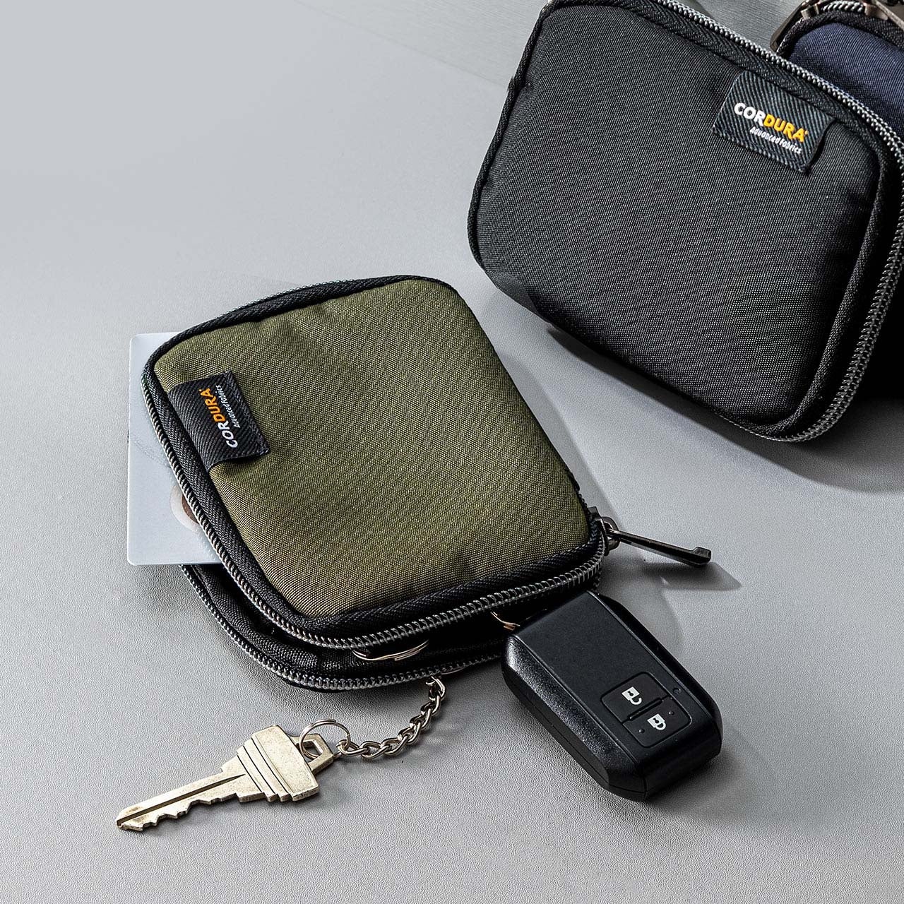 素材には撥水性のあるCORDURA生地を採用し、日常使いにうれしい丈夫さと軽さを両立しました。重量は約46gと軽量で、スマートキーやカードを入れても持ち運びの負担になりにくい設計です。デザインはシンプルで落ち着きがあり、カジュアルな装いはもちろん、ビジネスシーンにも自然になじみます。男女を問わず使いやすい、汎用性の高いアイテムです。