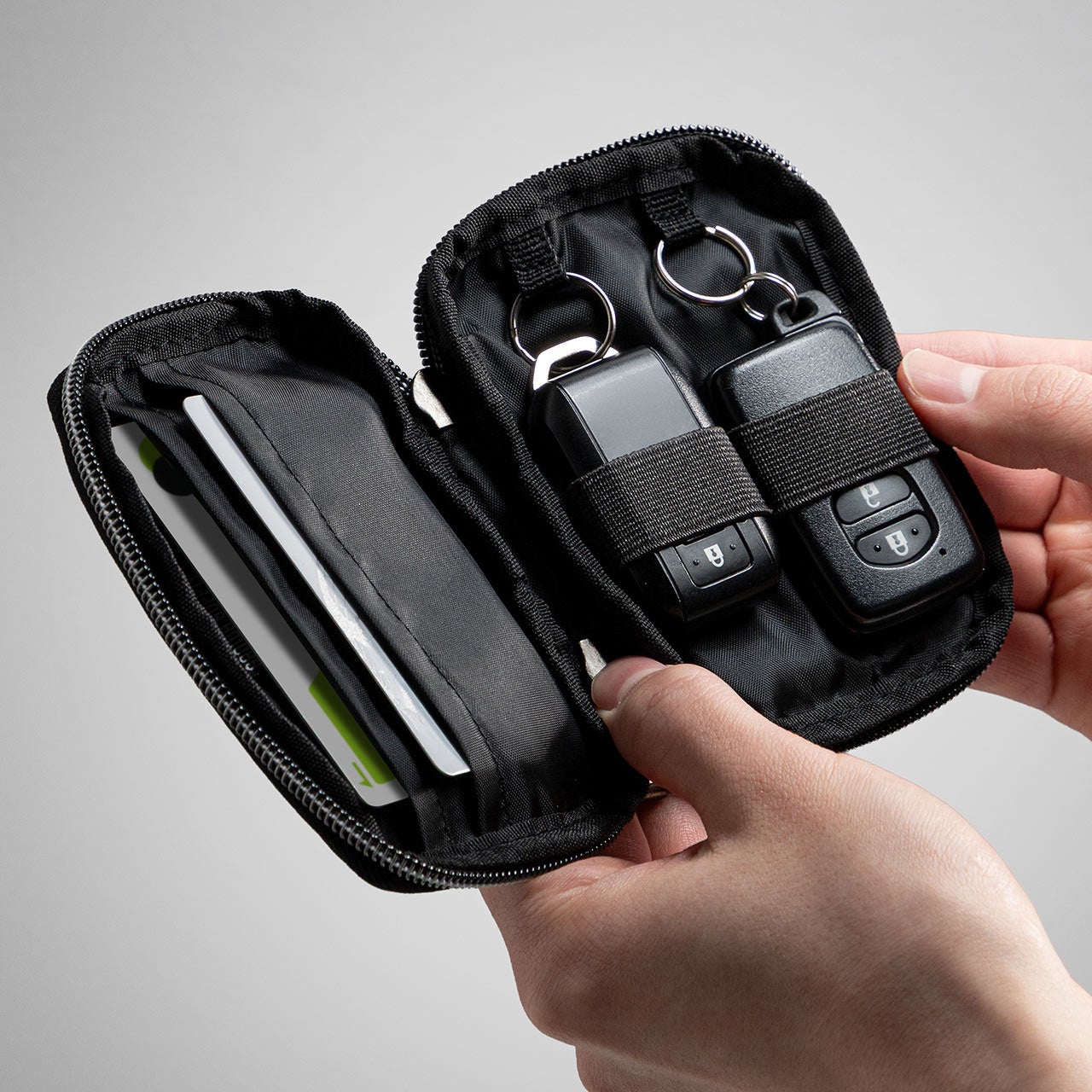 ・スマートキー2個を横並びで収納できる薄型設計で、かさばりにくく持ち歩きやすい