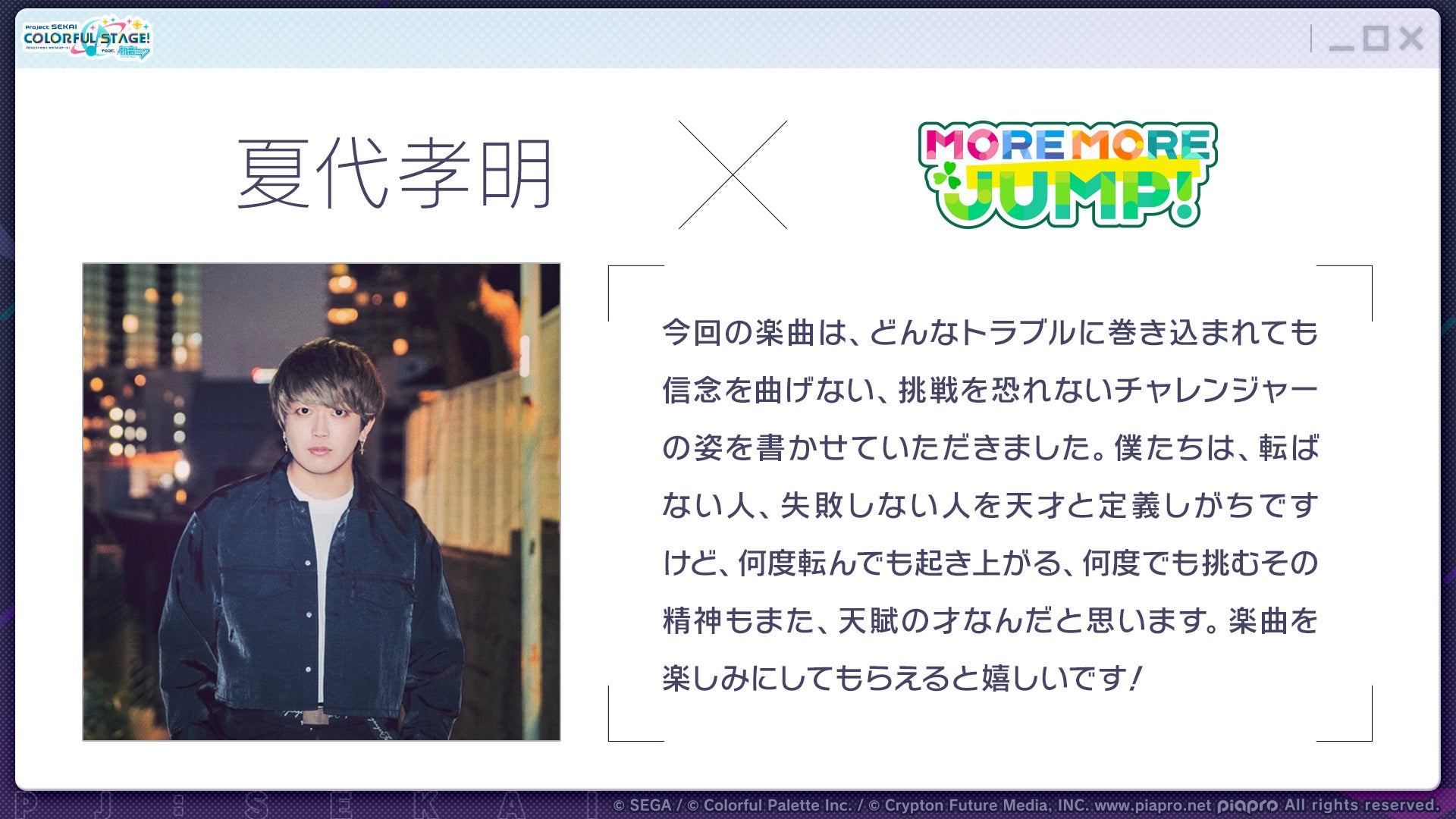 夏代孝明さんには「MORE MORE JUMP !」の書き下ろし楽曲を提供いただきます。