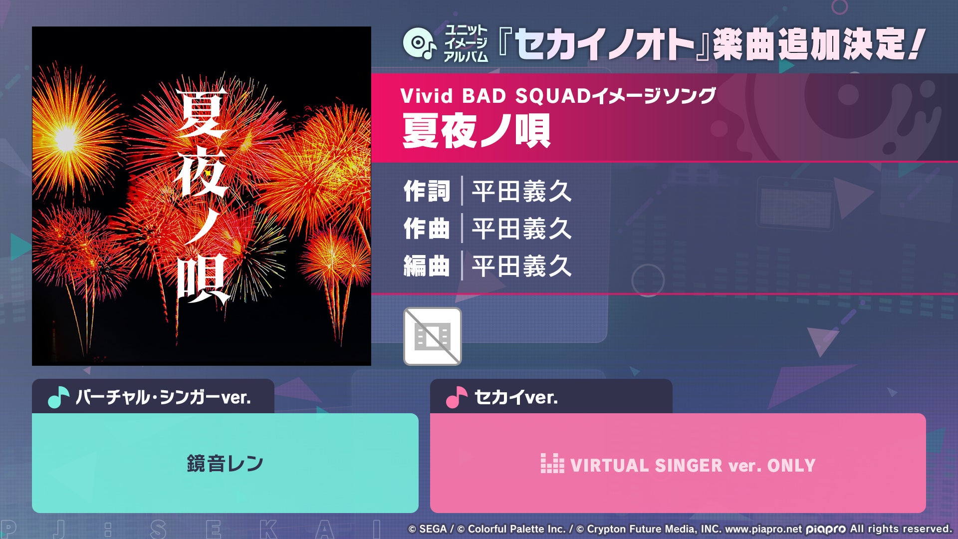 株式会社セガ(本社:東京都品川区、代表取締役 社長執行役員COO:内海州史)と株式会社Colorful Palette(本社:東京都渋谷区、代表取締役社長:近藤裕一郎)は、iOS/Android向けリズム&アドベンチャー『プロジェクトセカイ カラフルステージ! feat. 初音ミク(以下、プロジェクトセカイ)』について、新たな書き下ろし楽曲提供クリエイターとして、夏代孝明さんが参加することが決定いたしました。このほかにも、アニメ映画化の決定などの新情報を発表いたしました。