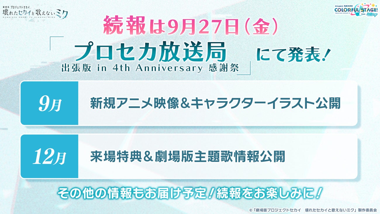 8月2日(金)より劇場で予告映像が放映されるほか、9月27日(金)に放送予定のプロセカ放送局では、新規アニメ映像の公開など多くの情報をお届け予定です。続報をお楽しみに!