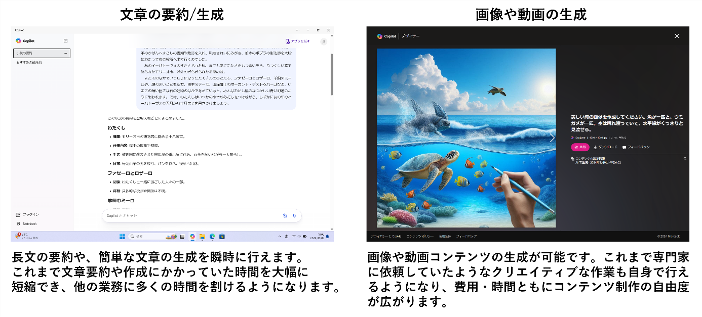 新モデルでは、「Copilot in Windows」を呼び出せるCopilotキーを搭載し、AI技術のスムーズな活用を可能にしています。具体的には、文章の要約/生成、画像や動画の生成などを簡単に行うことができ、業務を大幅に効率化します。