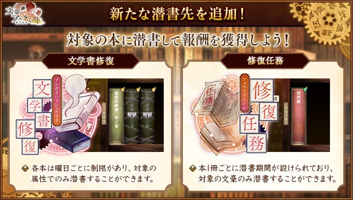 新たな潜書先「文学書修復」と「修復任務」を追加いたしました。