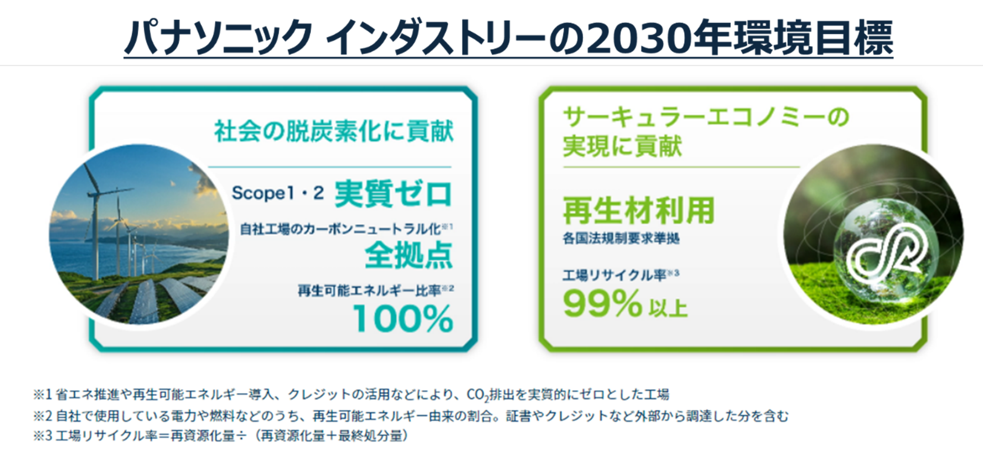 当社は、「パナソニック インダストリー環境ビジョン(https://www.panasonic.com/jp/industry/csr/environment/vision.html)」の実現に向け、サプライチェーンの脱炭素化、製品を通じた脱炭素化、サーキュラーエコノミーへの貢献に率先して取り組んでいます。