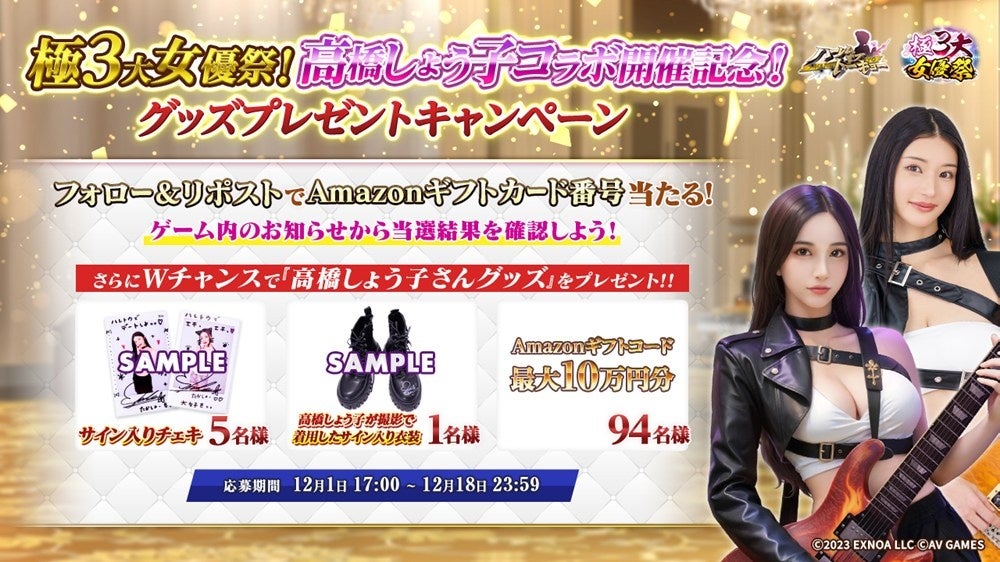 人気女優の高橋しょう子さんとのコラボレーションを記念して、抽選でゲーム内に登場する衣装を着用したサイン入りチェキや、撮影時に着用した衣装が当たるキャンペーンを実施致します。