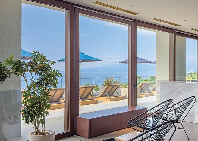 今回の実施する実証試験では、大磯プリンスホテルが運営する温泉・スパ施設「THERMAL SPA S.WAVE」内の海を臨む開放的な休憩スペースに、パナソニックの気流デバイスを2024年8月に設置しました。窓ガラスに設置した気流デバイスは、左右のスリットから吹き出した風を窓ガラスの中央で衝突させることで、まるで窓を通して風が流れてくるかのような面から生まれる風を生み出します。さらに、スリットから吹き出す風の風量に強弱をつけることで自然のゆらぎを再現。窓ガラスの向こうに広がる自然を屋内でも感じられ、まるで自然の中で休憩をしているような「ととのう風」を体験することが可能です。