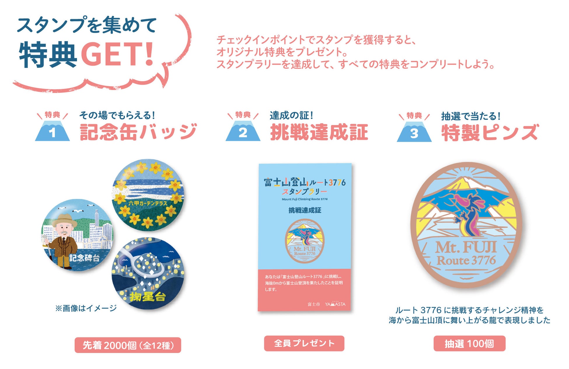 この度、ヤマスタで実施する「富士山登山ルート3776スタンプラリー」では、「富士山登山ルート3776」のルート上の10か所でデジタルスタンプが獲得でき、その場所の風景や歴史にちなんだデザインが楽しめます。さらに、スタンプを集めると、達成状況に応じて記念缶バッジや挑戦達成証がもらえるほか、抽選で当たる特製ピンズに応募できます。