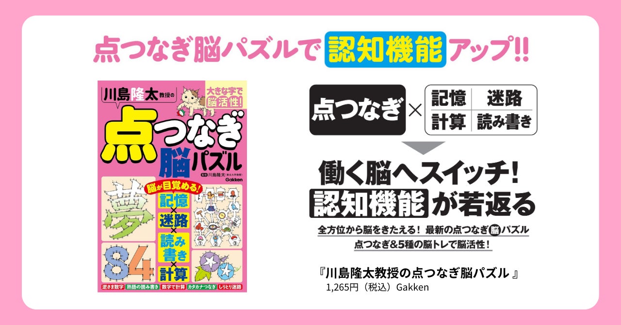 株式会社 学研ホールディングス(東京・品川/代表取締役社長:宮原博昭)のグループ会社、株式会社 Gakken(東京・品川/代表取締役社長:五郎丸徹)は、2024年2月16日(金)に認知機能を鍛える『川島隆太教授の点つなぎ脳パズル』を発売いたしました。
