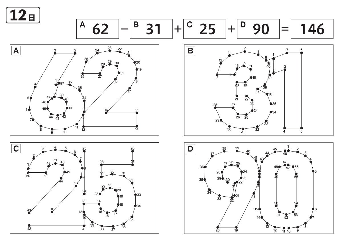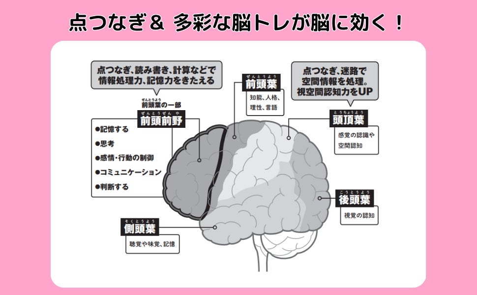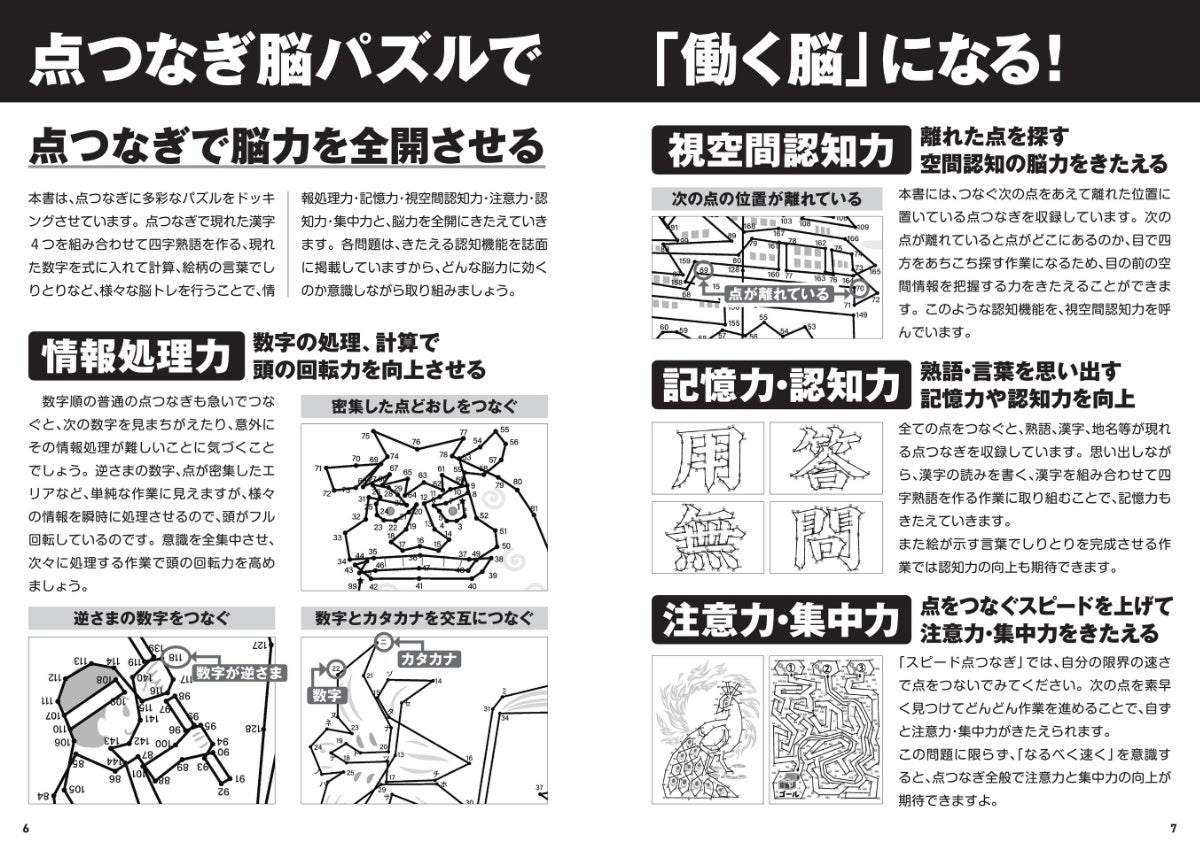 点つなぎ×文字の読み書き、点つなぎ×迷路パズル、点つなぎ×計算など、点つなぎに多彩なパズルをドッキング。情報処理力・記憶力・視空間認知力・注意力・認知力・集中力と、脳力を全開にきたえて【認知機能をアップ】できる問題をそろえました。