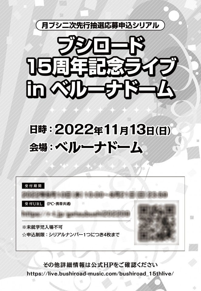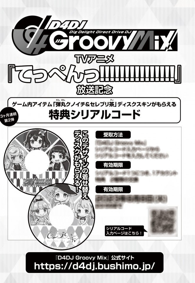 11月に開催される「BanG Dream! Special☆LIVE Girls Band Party! 2020→2022」月ブシ特別先行抽選応募申込シリアルと、「ブシロード15周年記念ライブ」に申し込める二次先行抽選応募申込シリアル、さらに『D4DJ Groovy Mix』アプリ内でTVアニメ『てっぺんっ!!!!!!!!!!!!!!!』に登場する「弾丸クノイチ」の「セレブリ茶」着せ替えディスクスキンがもらえるシリアルの3種類。