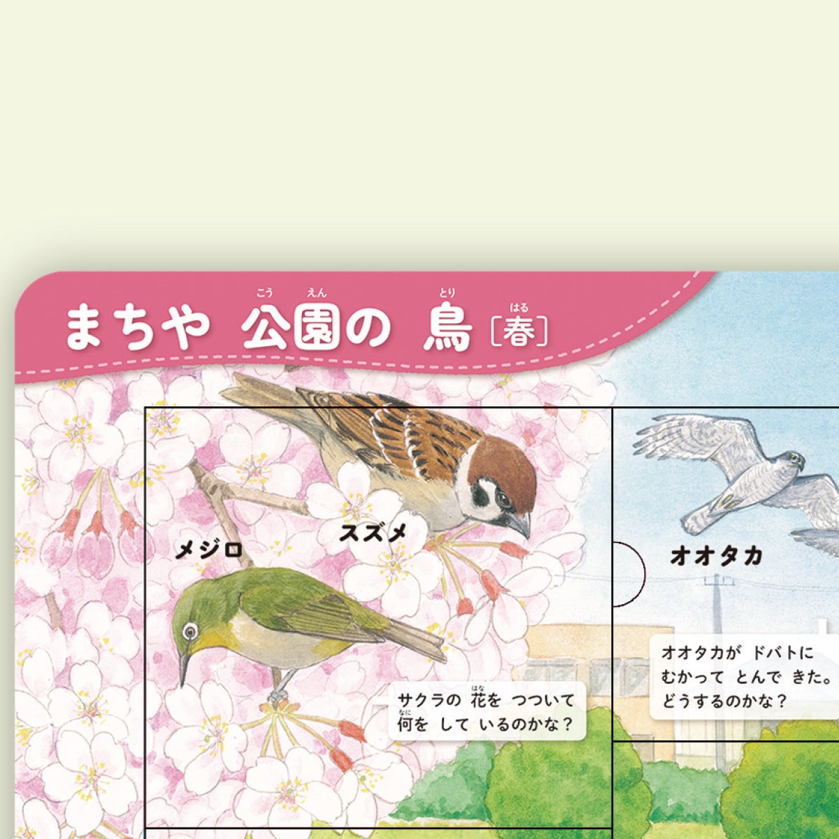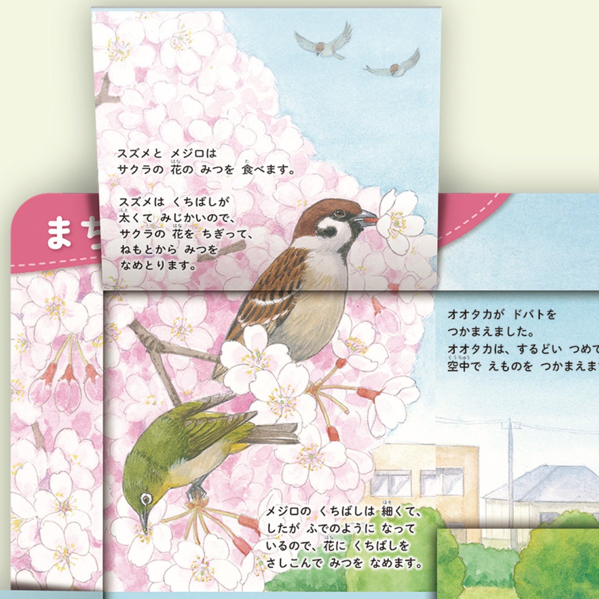 しかけをめくると、桜の木にやってきたスズメとメジロが花のみつをなめている絵が出てきたり、しげみからカルガモのひなたちが出てきたり、「ホーホケキョ」と聞こえるしげみにはウグイスがいたり、鳥たちのひみつが楽しい絵がわりでわかります。