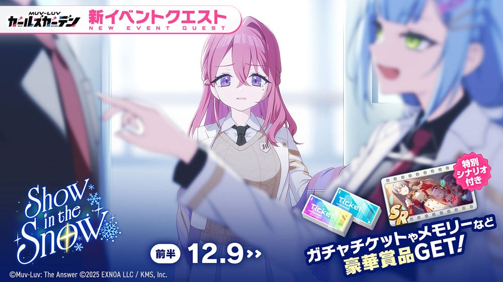 合同会社EXNOA(本社:東京都港区、CEO:東條 寛、URL:https://games.dmm.com/)と株式会社KMS(本社:東京都品川区、代表:梶原 健太郎、URL:http://kms3.com/ )が贈るマブラヴ最新作『マブラヴ ガールズガーデン』(以下、マブガル)が12月9日(火)より、新イベント【Show in the Snow】を開始したことをお知らせいたします。