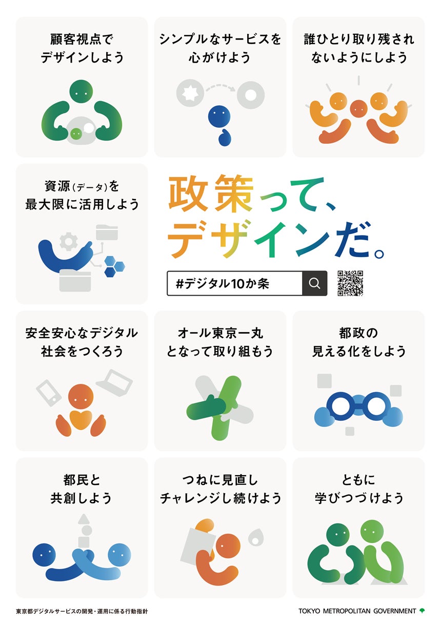 東京都では、都民が使いやすく、満足度の高いデジタルサービスを提供するために、東京都デジタルサービスの開発・運用に係る行動指針を定めています。この指針では「価値観(行動規範―デジタル10か条―)」と「作り方(ガイドライン)」の2つを共有し、推進しています。