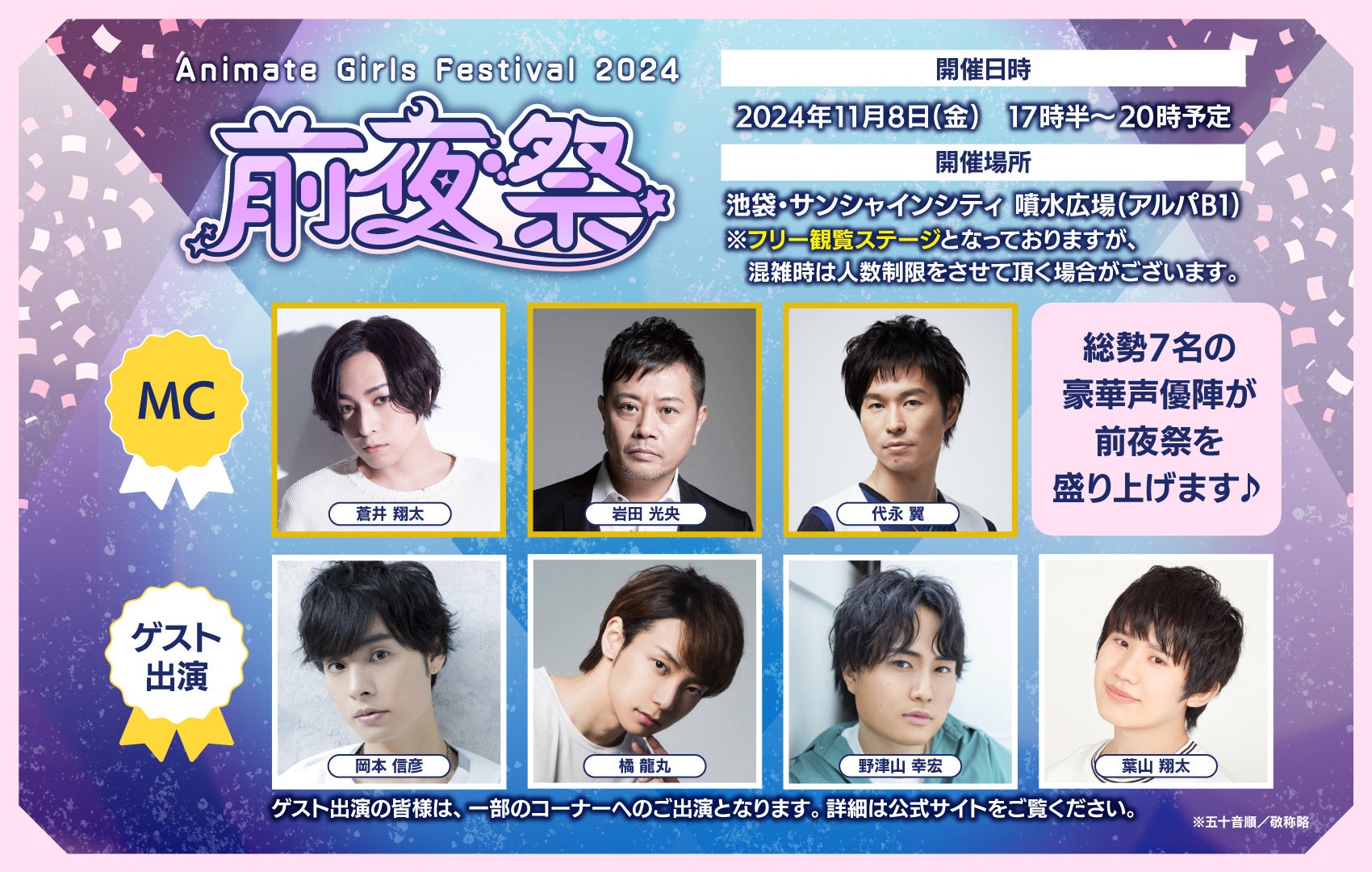 初報で発表された蒼井翔太さん、岩田光央さんに加え、代永翼さん、岡本信彦さん、橘龍丸さん、野津山幸宏さん、葉山翔太さんのご出演が決定。合計7名の豪華声優陣が、アニメイトガールズフェスティバル2024の前夜を彩ります。