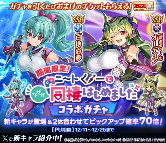 合同会社EXNOA(本社:東京都港区、CEO:東條 寛、URL:https://games.dmm.com/ )が運営するDMM GAMESにおいて『神姫PROJECT』は、『ニートくノ一となぜか同棲始めました』とのコラボ神姫「百地彩夢」と神姫「オーディン」が登場することを発表した。コラボを記念した1日1回無料10連ガチャも開催中。