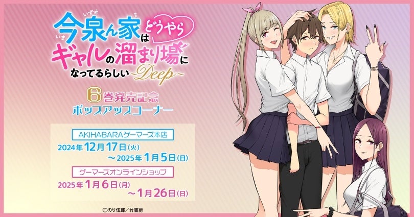 株式会社カードラボ ゲーマーズ(本社:東京都豊島区、https://www.gamers.co.jp/ 以下ゲーマーズ)は、2024年12月17日(火)より「今泉ん家はどうやらギャルの溜まり場になってるらしい~DEEP~」6巻発売記念ポップアップコーナー を開催することをお知らせいたします。