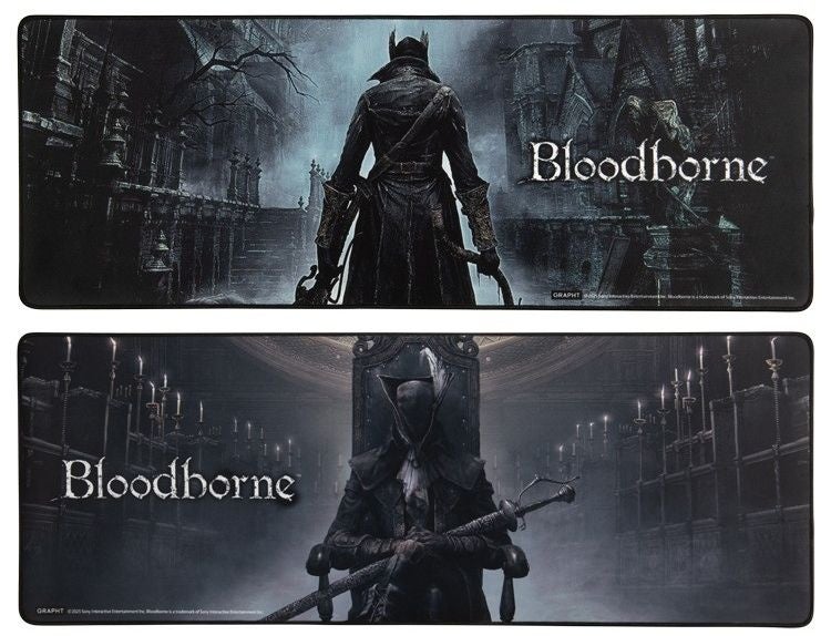 「Bloodborne」のキービジュアル(狩人)とダウンロードコンテンツ「The Old Hunters」のキービジュアル(時計塔のマリア)をモチーフにしたデスクマットです。キービジュアルの美しく重厚な世界観や暗がりに浮かび上がるような緊迫感を再現しました。
