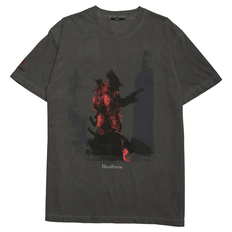「Bloodborne」より、獣狩りの銃を携えて振り向く狩人をヴィンテージ風のプリント技法にて表現したTシャツです。