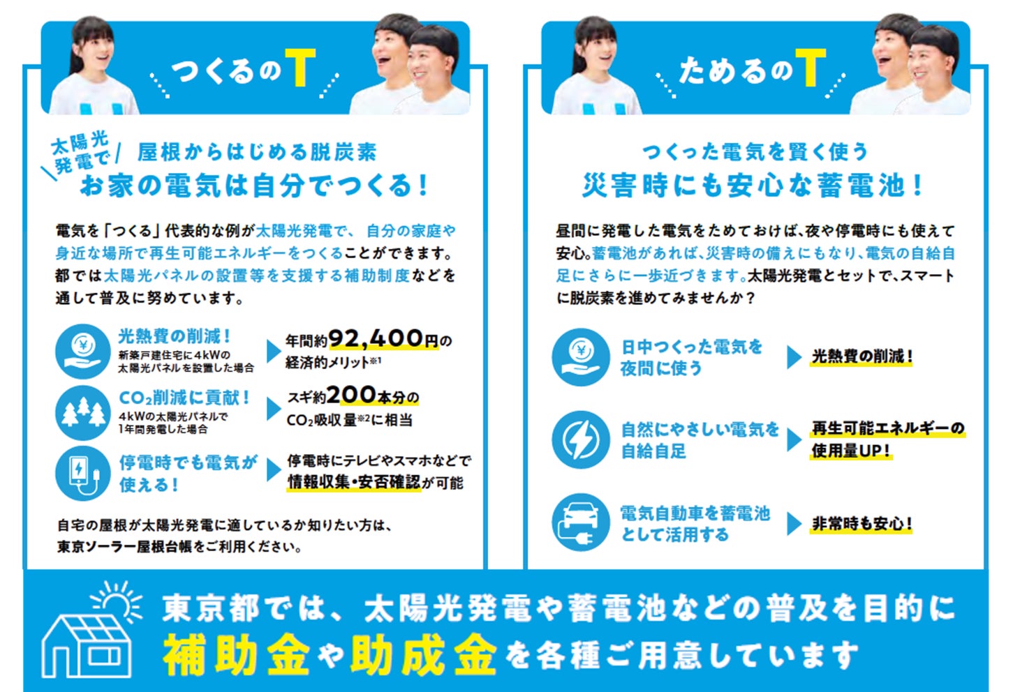 太陽光発電に必要な太陽光パネルや電気をためるための蓄電池を、より家庭に普及させるため、東京都では補助金や助成金を各種ご用意しています。私たちの暮らしに取り入れられるHTTアクションについて、お得な支援とともに、提案しています。
