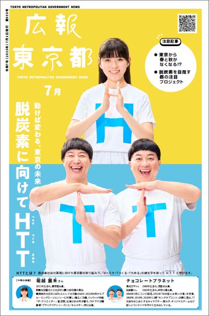 2025年度は、タレントの堀越麗禾さん、チョコレートプラネットの長田さんと松尾さんの3名に東京都の「HTT」広報活動に携わっていただいており、今回の夏のキャンペーンテーマ「へらすの次は、つくる、ためる。」で、楽しくHTTアクションを伝えています。7月号の広報東京都は、夏のHTTのキャンペーンと連動し、さわやかな色合いで「脱炭素に向けて」を伝える表紙にしています。