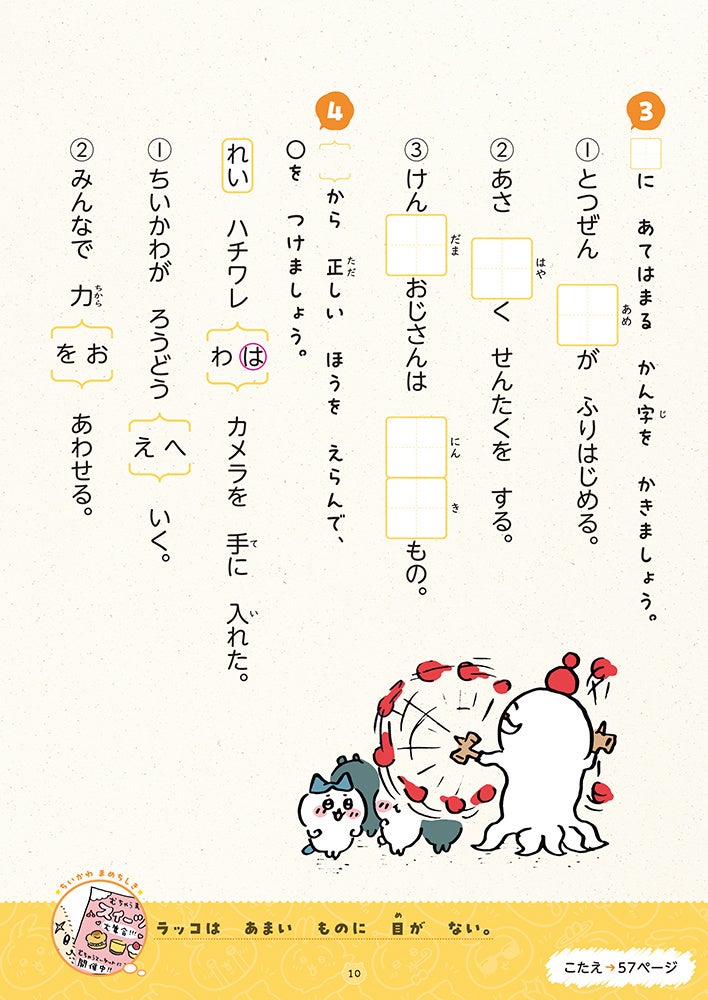 またシリーズ新作「小学1年生のこくご」も登場。本書では「ちいかわ」の原作を参考にした文章読解や、語彙力、学年の全漢字が学べるようになっています。特に、文章読解には、小学1年生が無理なく取り組めるように工夫が盛りだくさんです。