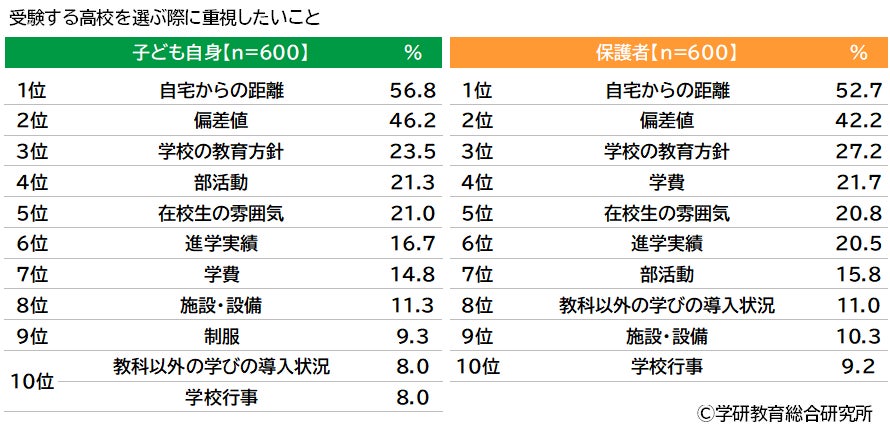 子ども自身が受験する高校を選ぶ際に重視したいことをきいたところ、1位「自宅からの距離」(56.8%)、2位「偏差値」(46.2%)、3位「学校の教育方針」(23.5%)、4位「部活動」(21.3%)、5位「在校生の雰囲気」(21.0%)となりました。