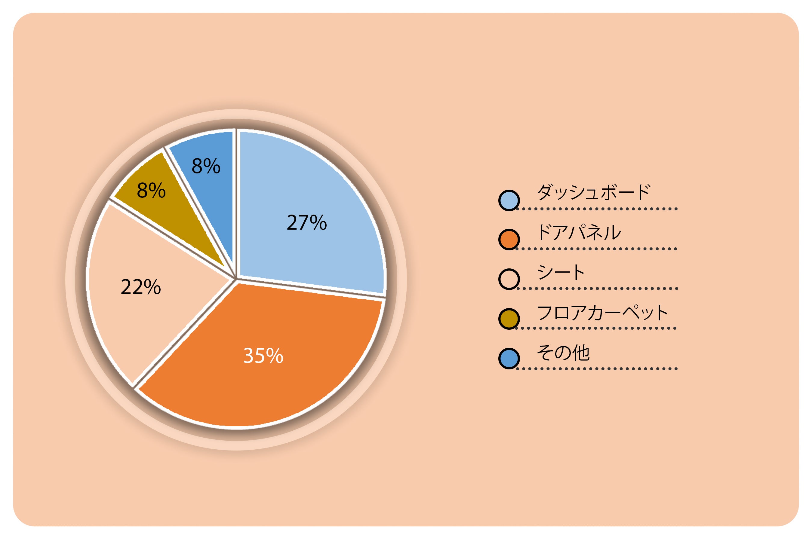 自動車内装材は、自動車のヘッドレスト、シートカバー、ドアパネル、コンソール、フロアマット、ダッシュボードなどに使用されています。
