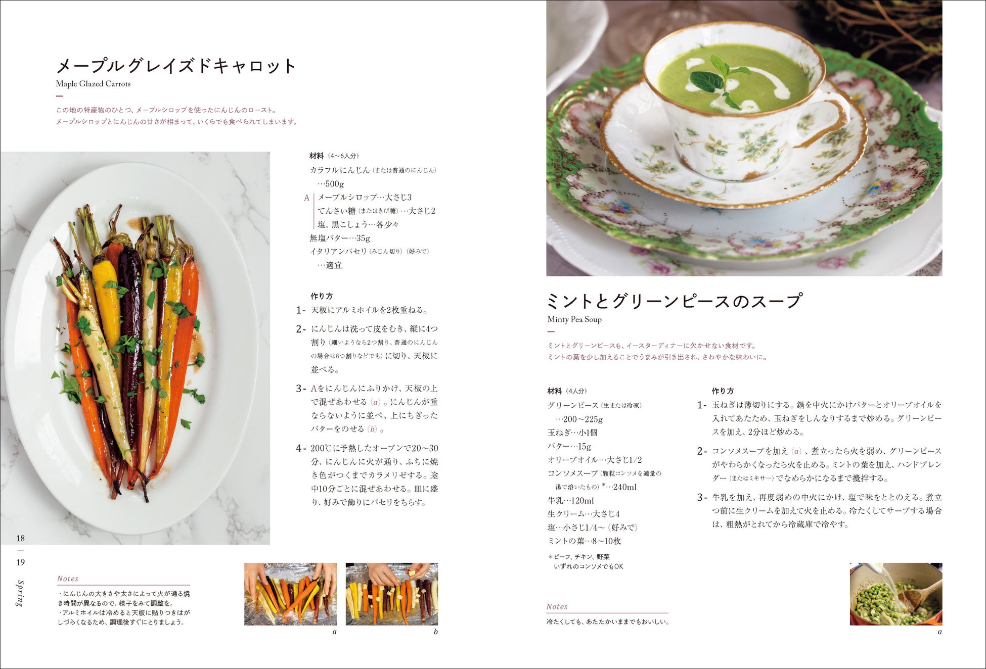春の章から、春に収穫を迎える特産品メープルシロップを使ったにんじんのロースト、イースターに欠かせないミントとグリーンピースを使ったスープ。