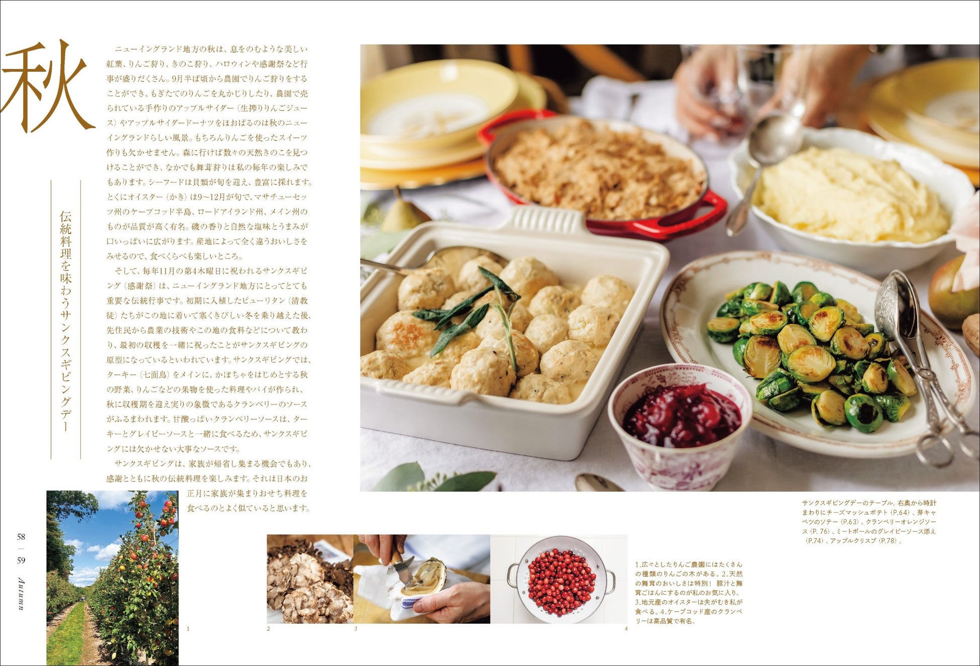 クラムチャウダー、ボストンベイクドビーンズ、りんごのスイーツなど、米北東部の四季折々のおいしい家庭料理レシピを50以上掲載。旅のごはんBOOK『ボストンから、ニューイングランド地方の旬ごはん』発売