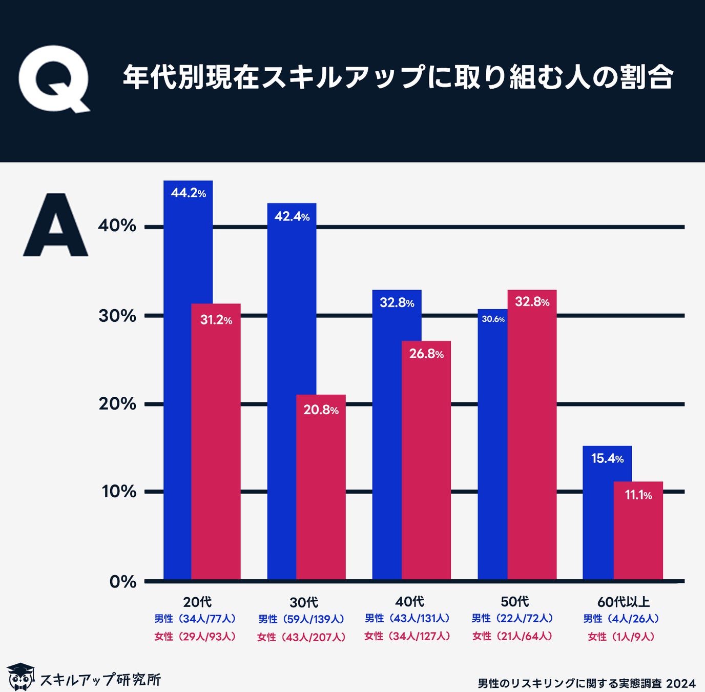 女性のリスキリングをめぐる実態を解明すべく、スキルアップ研究所では女性のリスキリングに関する実態調査を実施した。また、対照群となる男性にも同内容の調査を実施した。