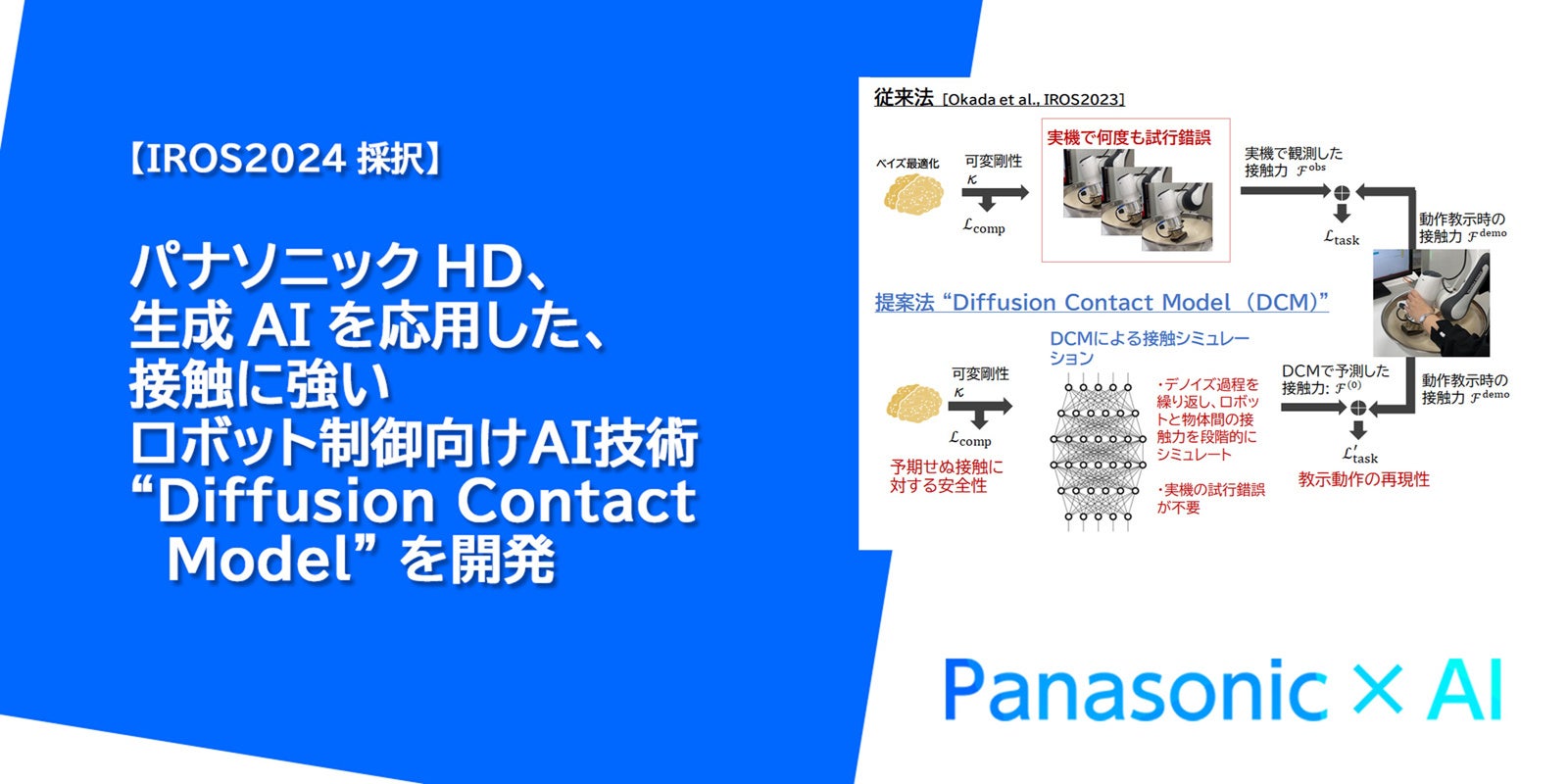 人手不足が深刻な社会課題となる中、産業用ロボットの活用がさまざまな分野で進んでいます。なかでも製造業やサービス業などでは、人や物との接触を伴うタスクが数多く存在します。しかし、ロボットが人や物に触れた時の動きや力は、非常に複雑でシミュレーション環境でのモデル化が難しく、安全で正確な動作を実現するには、実機を用いて事前に何度も試行錯誤させる必要があります。そこでパナソニックHDは、ロボット導入にかかるコストや時間を押し上げるこの課題に対処するため、昨今画像生成に用いられることの多い「拡散モデル(Diffusion Model)」を応用したロボット制御向けAI技術“Diffusion Contact Model”を開発しました。