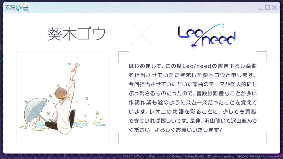 『プロジェクトセカイ』書き下ろし楽曲提供クリエイターとして、葵木ゴウさんが参加することが決定いたしました。