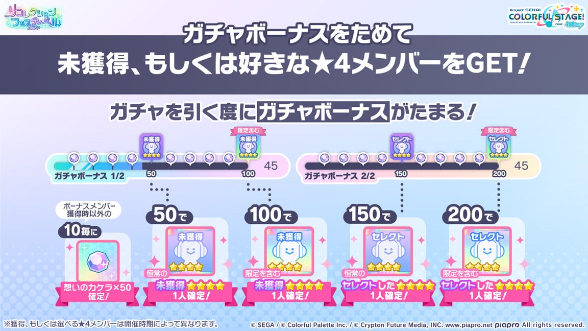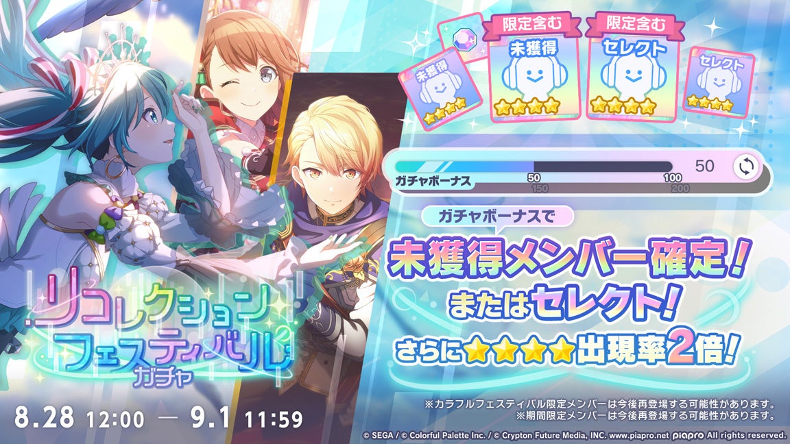 8月28日(水)より、新ガチャ「リコレクションフェスティバルガチャ」を開催いたします。「リコレクションフェスティバルガチャ」は、過去に登場したカラフェス限定メンバー、期間限定メンバーの一部が再登場するほか、★4メンバーの出現率が2倍となり、さらにガチャを引く度に貯まるガチャボーナス量に応じて、「未獲得メンバー」や「セレクトしたメンバー」が獲得できるガチャとなっております。