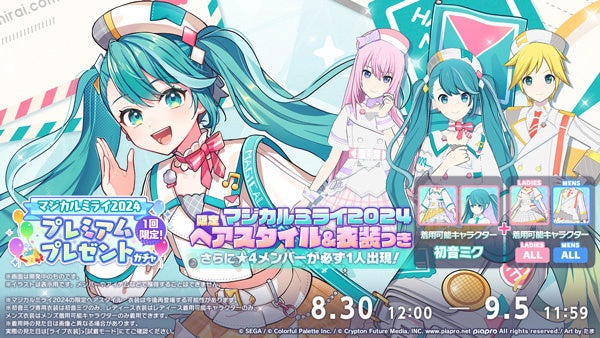 また、同日より開催される「[マジカルミライ2024]プレミアムプレゼントガチャ」では、たまさん( https://x.com/tamak0 )による描き下ろしデザインの限定衣装と、初音ミク専用ヘアスタイルが獲得できるほか、「マジカルミライ2024」のテーマソング「アンテナ39」(作詞・作曲:柊マグネタイト)が新たなリズムゲーム楽曲として追加されます。