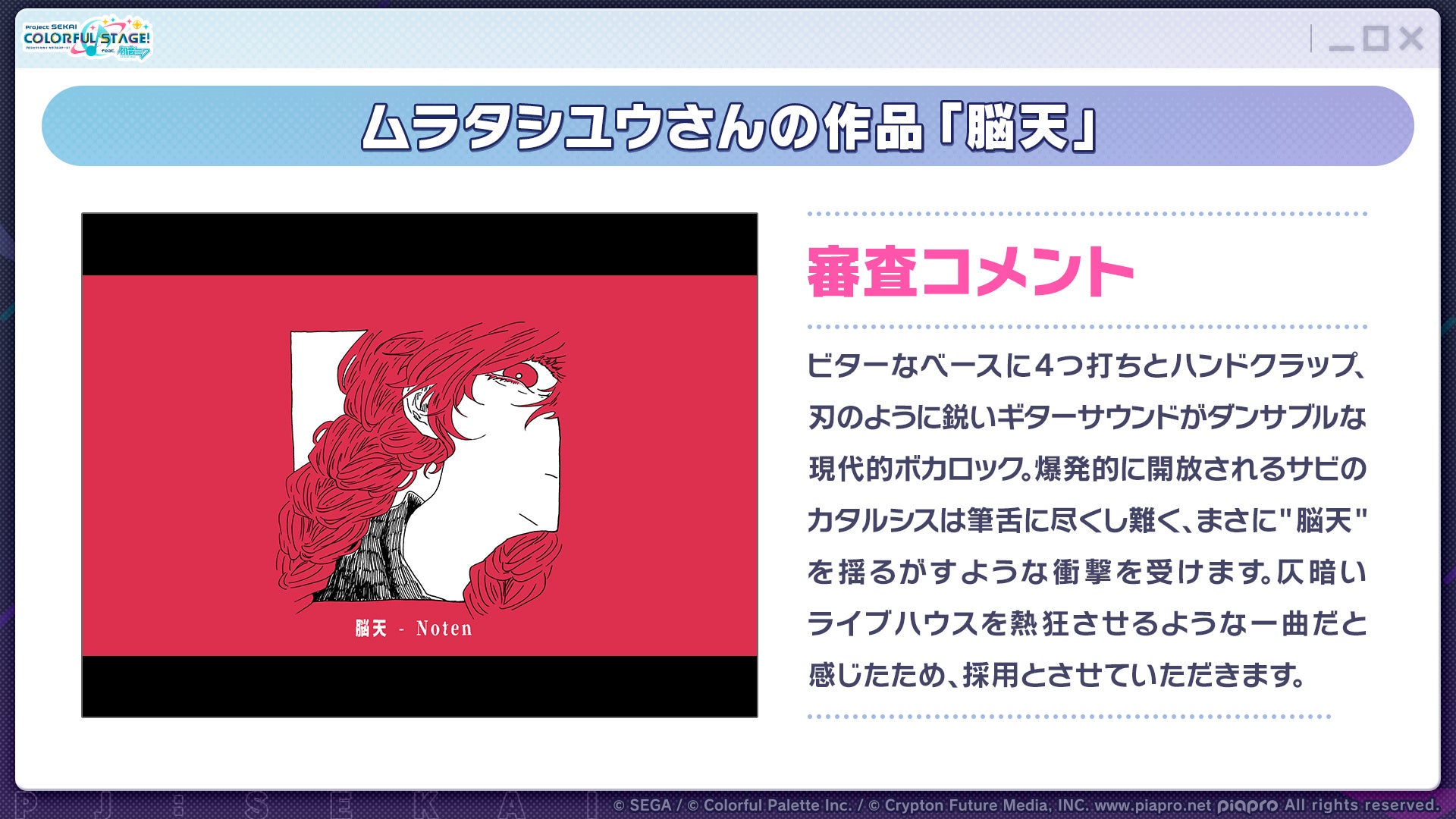 「一緒に作ろう!第23回楽曲コンテストプロセカNEXT」の採用作品が、「脳天」(作詞・作曲:ムラタシユウ)、「パリィ」(作詞・作曲:宮守文学)に決定いたしました。採用作品は今後リズムゲーム楽曲として追加予定です。
