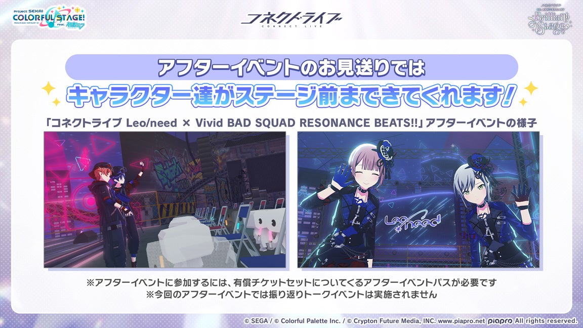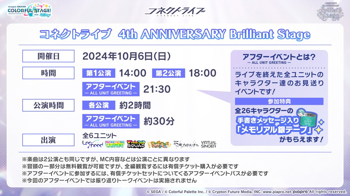 プロジェクトセカイ4周年を記念した「コネクトライブ 4th ANNIVERSARY Brilliant Stage」が、10月6日(日)に開催決定いたしました。本公演は、5ユニットのキャラクターと、各セカイのバーチャル・シンガーが出演する、約2時間の公演となります。14時、18時の2公演があるほか、21時30分からは「アフターイベント― ALL UNIT GREETING ―」の実施も予定しております。