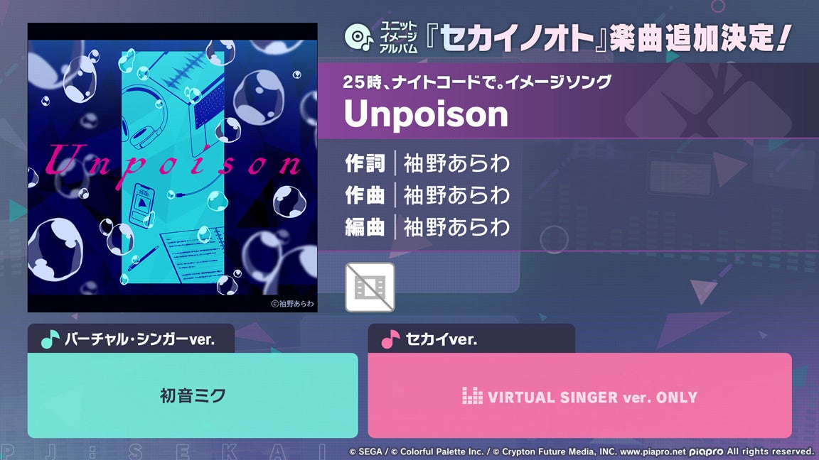 新たなリズムゲーム楽曲として、以下5曲の追加が決定いたしました。「レイヤーノート」(作詞・作曲:吉田ヨシユキ)は、「一緒に作ろう!第22回楽曲コンテストプロセカNEXT」の採用作品、「Unpoison」(作詞・作曲:袖野あらわ)は、「セカイノオト vol.1」の収録楽曲となります。