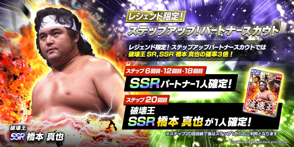 さらに、初登場のレジェンド限定新SSRパートナー「[破壊王]橋本真也」と新SRパートナー「[破壊王]橋本真也」がピックアップ対象パートナーとして、ステップアップ回数に関わらず同レアリティ内でのスカウト確率が通常の3倍となっております。
