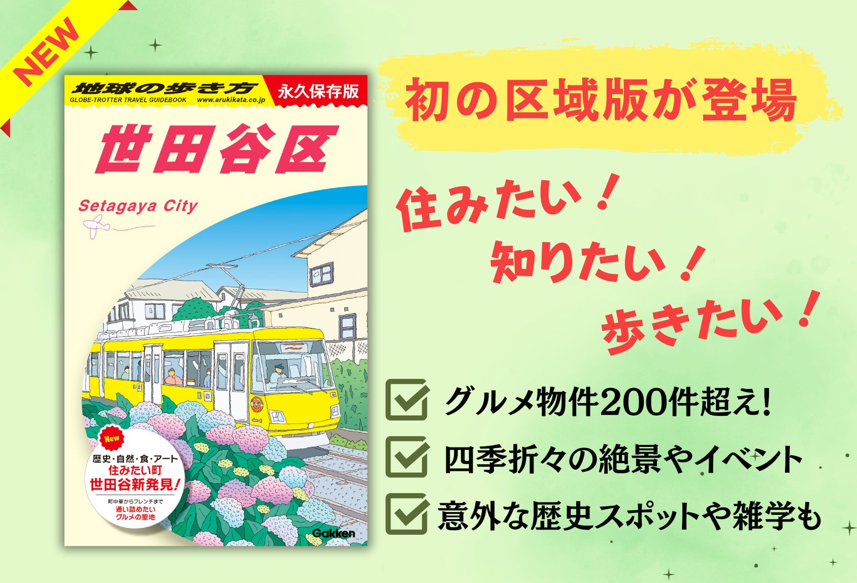 シリーズ累計発行67万部超え! 注目の「地球の歩き方」国内版13タイトル目の新刊は、初の区域版『世田谷区』。グルメを中心に、自然、アート、歴史など多彩なテーマで地域の魅力や雑学を紹介します。